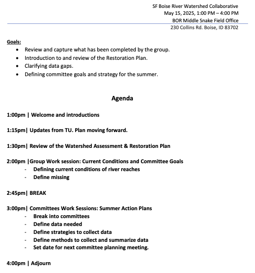 Now that the government shutdown has ended a date and time is set for the next meeting of the South Fork Boise River Watershed Group. The meeting will be Tuesday December 2 at the Bureau of Reclamation Snake River office at noon.