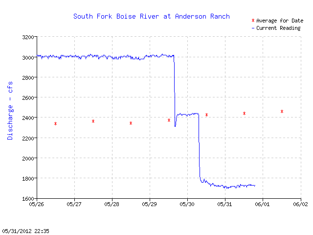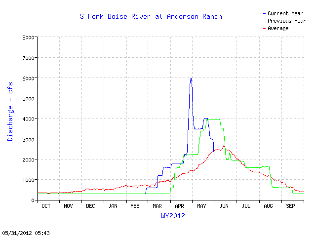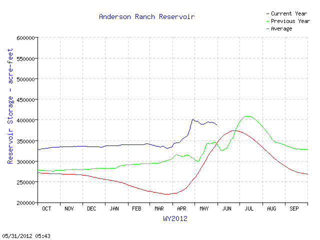 The above chart shows Anderson Ranch was near full at the end of April, and then over the past month a net release of water pass out of the reservoir. A big inflow in late April put the reservoir at it’s peak.