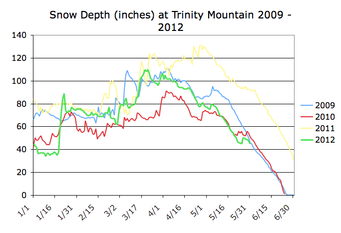 The water equivalent of the remaining snow is the green line and it tracks with 2010 and 2009. The cold wet weather over Memorial Day weekend added a few more days of water volume as the green line makes a blip on the chart.