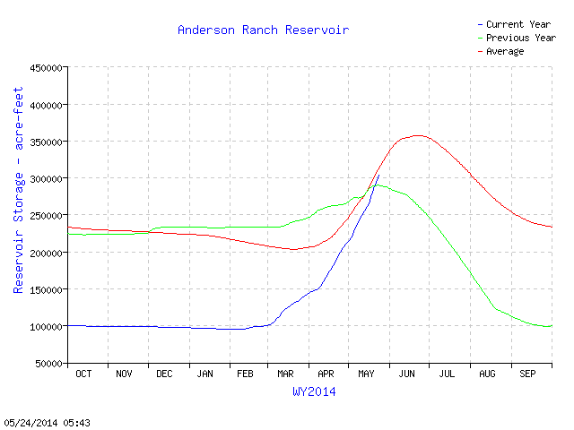 There were a couple of years where the April 1 plan was not met, such as in 1993 and 2002 when Anderson Ranch reservoir was approximately 25 percent full. The flows in those years did not increase until May. In 1987 and 1988 the flow increase was delayed for a couple of weeks. And now 2014 stands out as the latest year on record where we will probably come close to June before the river flows increase.