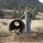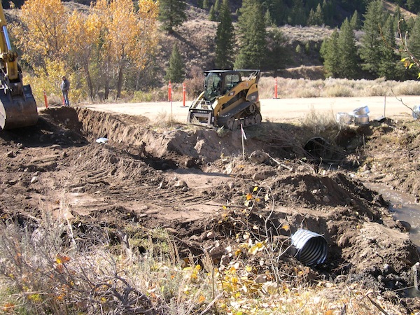 Photo at right shows the clearing and grubbing on the downstream end of the culvert. For the first time a clear picture of the stream gradient can be fully appreciated. And even this did not reveal a surprise (more after the jump). Prior to clearing, willow bushes and aspen trees obscured Pierce Creek between the South Fork Boise road and the South Fork Boise River.