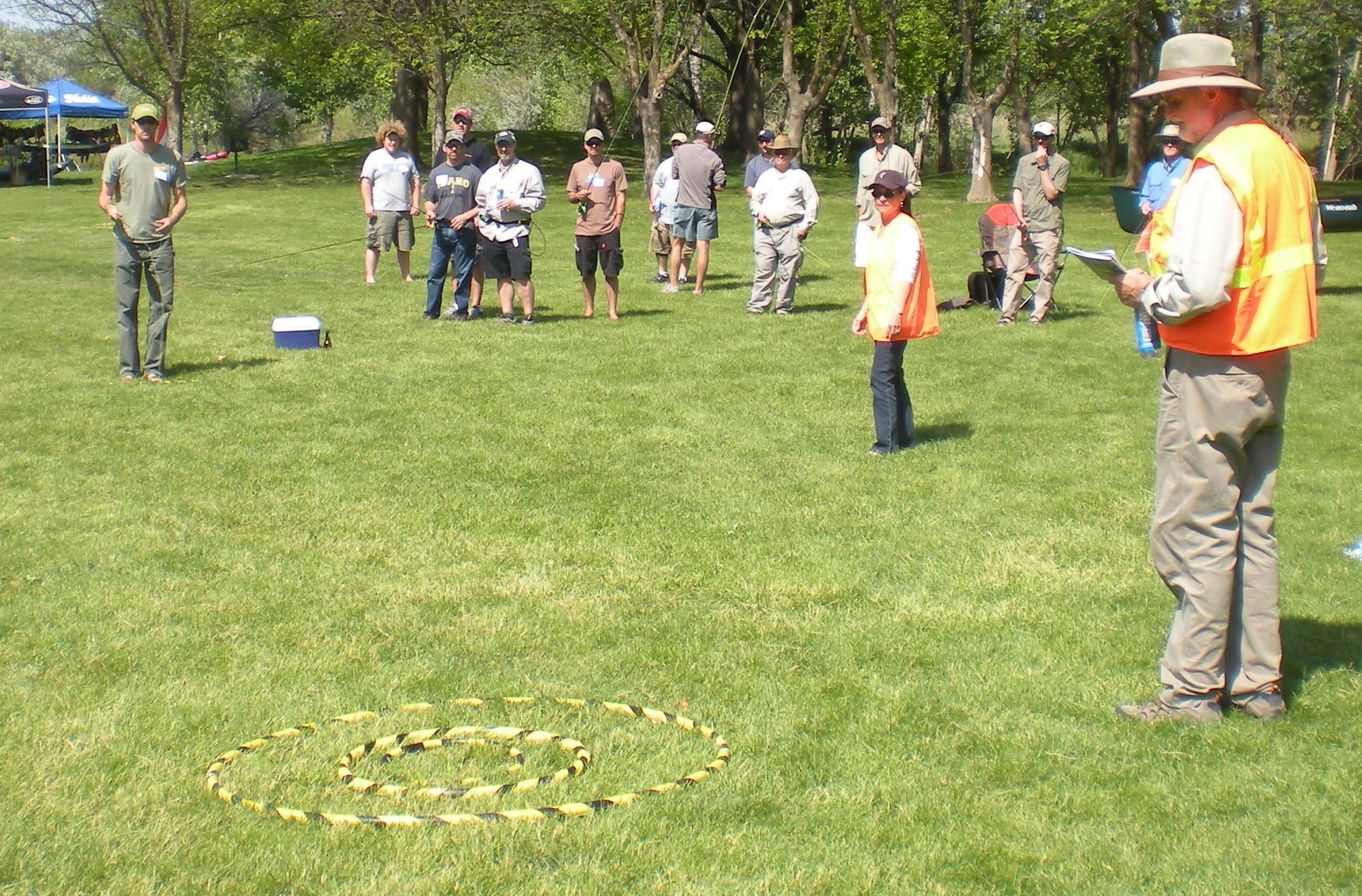As near perfect weather as could be expected greeted the fly casting competitors Saturday morning. Hardly any winds. The day warmed up through the morning as 12 teams competed in the Gold Division. Four person teams competed on 14 casting targets or “holes” with a team’s best three individual player scores per hole added together for a team score.