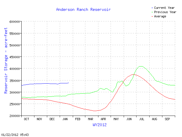 The short answer is it’s too early to know.  The longer answer is if we have average snow through the rest of winter and spring it will be on top of a reservoir that is much more full than normal.  Below is a graph showing the water content in Anderson Ranch Reservoir:
