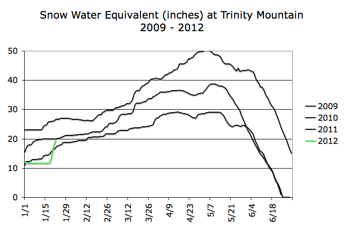 Finally, here’s a graph of the snow water equivalent.  The recent snow takes the amount from an abysmal situation to something in the moderate zone: