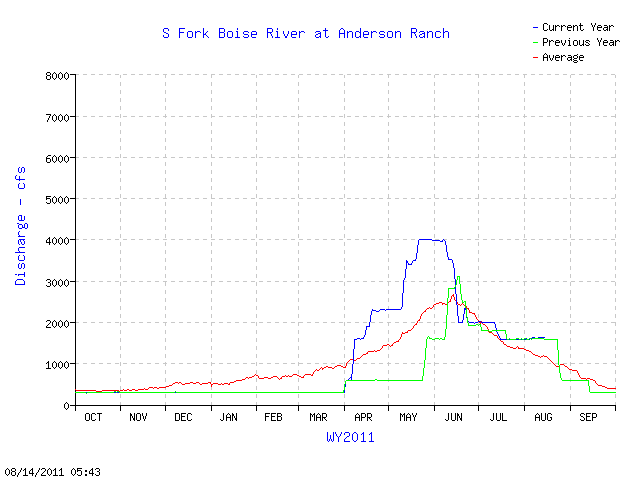 Anderson Ranch reservoir is holding a lot more water today than it was a year ago. When looking at the flow releases in 2010 and 2009 the table above and the chart below shows it was late August when the flows were cut from the 1,600 cfs rate.